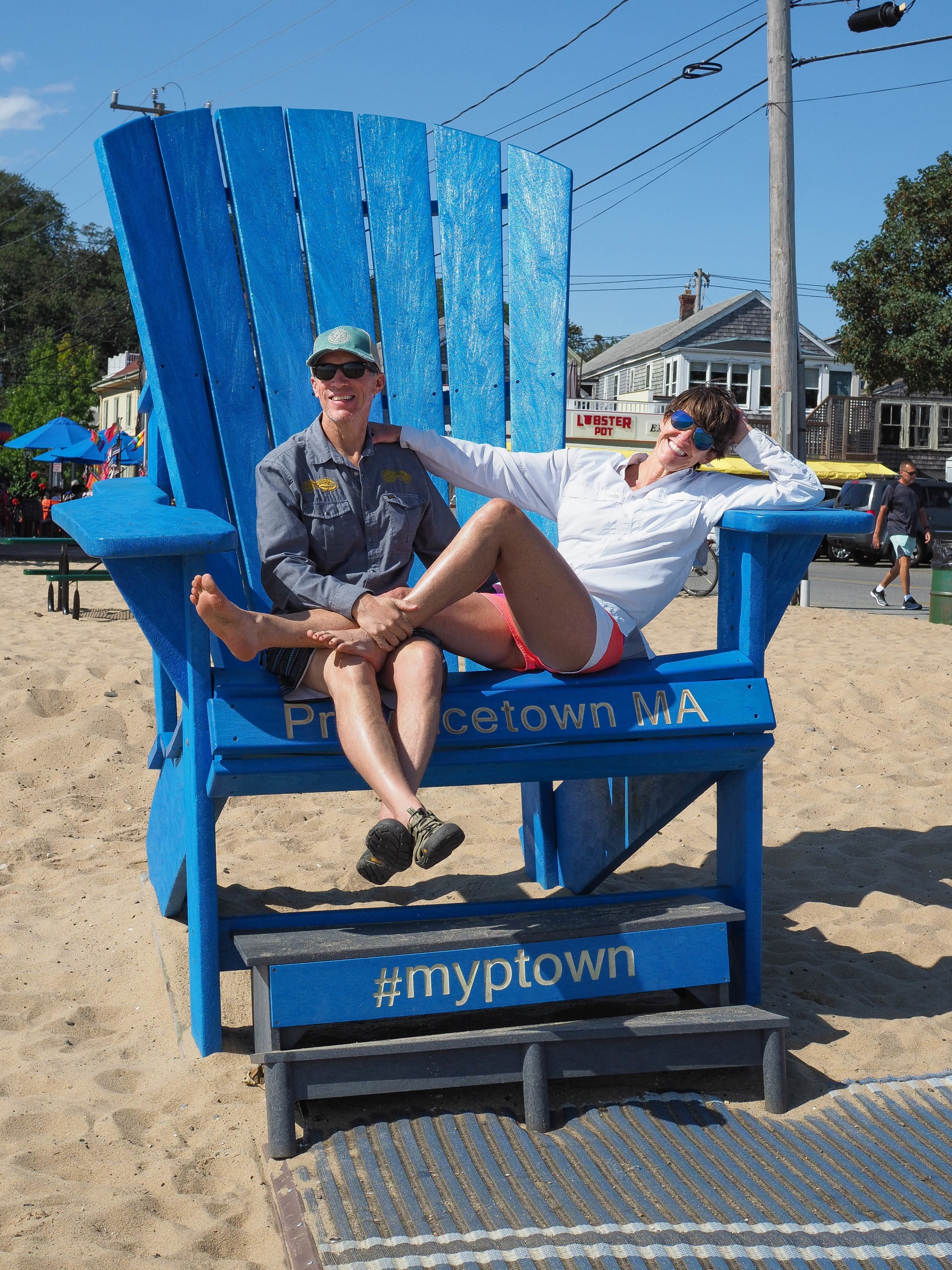 Chris and Pam LeBlanc sit on a giant Adirondack chair in Provincetown, Cape Cod. Photo by Sara McCabe