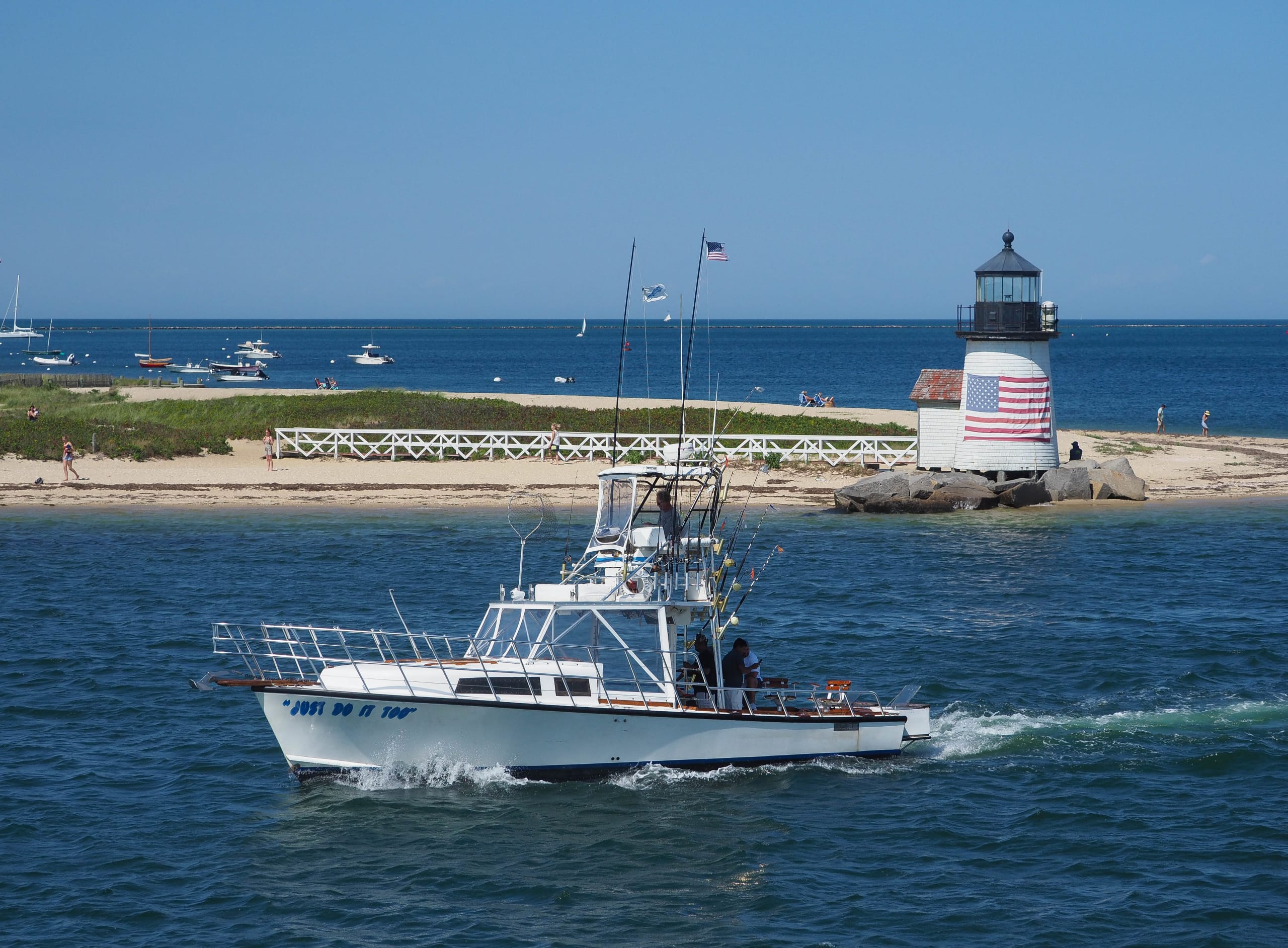 A boat glides past the lighthouse in Nantucket, off of Cape Cod. Pam LeBlanc photo