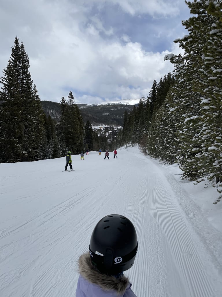 Writer Mauri Elbel follows her youngest down an easy groomed green at Winter Park Resort. Photo by Mauri Elbel