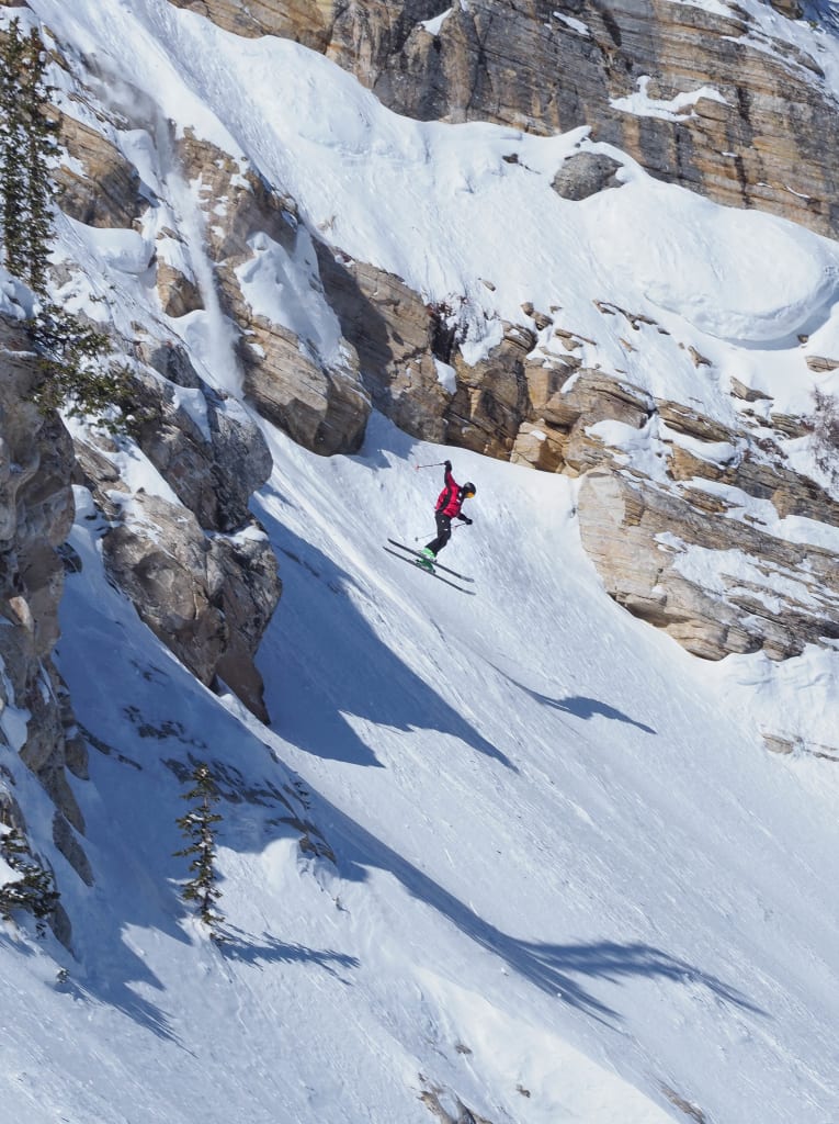 An expert skier plunges off a cliff at Solitude Mountain Resort. Pam LeBlanc photo